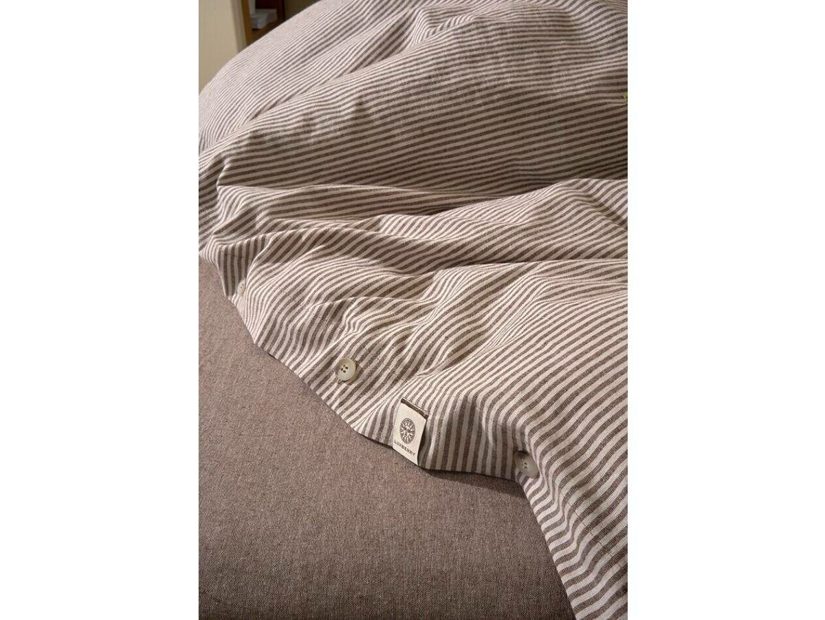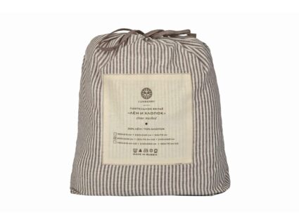 Наволочки и пододеяльник- двусторонние, одна сторона в полоску, оборотная - однотонная, коричневый меланж.
