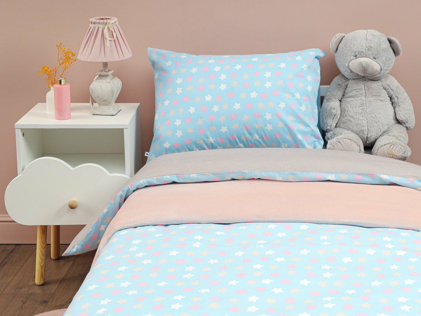 Пододеяльник –двусторонний: верх из ткани А (принтованная ткань), обратка из ткани В (однотонная рогожка), с потайной молнией.