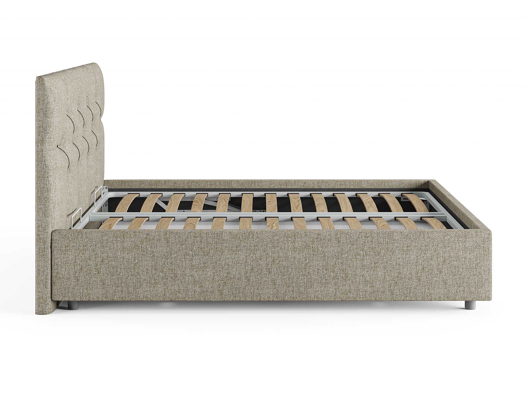 Кровать комплектуется металлическим основанием (без опор), которое имеет 13 рядов встроенных березовых ламелий на каждое спальное место, обеспечивая равномерное распределение нагрузки.