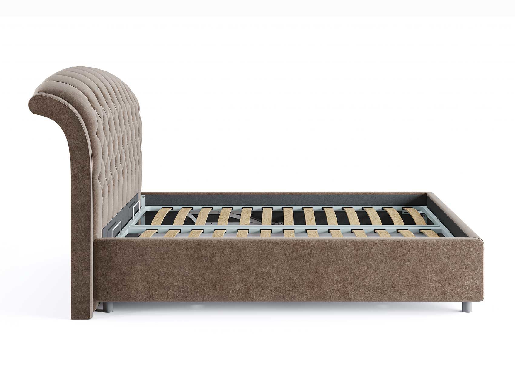 Кровать комплектуется металлическим основанием и подъемным механизмом со вместительным бельевым ящиком. Дно бельевого ящика легко сдвигается для обеспечения уборки под кроватью.