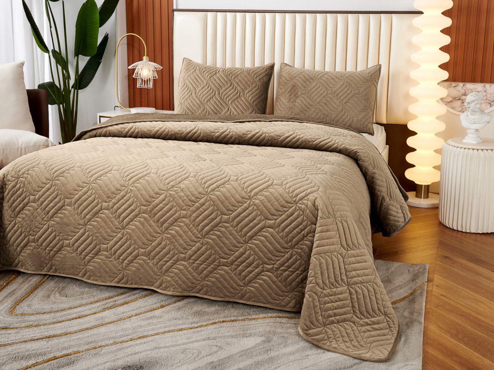 Покрывала выполнены в 10 оттенках: крем, мокко, пепельный, песочный, светло-бежевый, светло-серый, серый, темно-серый, чайная роза и черный. Стежка в виде геометрического орнамента подойдет к любому современному интерьеру. Из-за особого плетения, велюровая ткань покрывала отражает свет и красиво переливается при различном освещении.